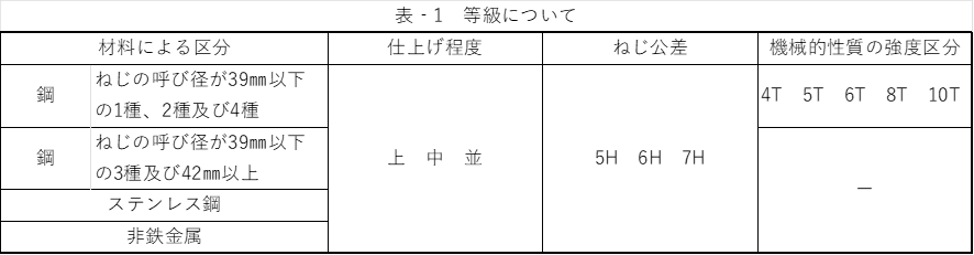 六角ナットの等級については、製品の材料によって区分し、表‐1に示す仕上げ程度、ねじの公差域クラス及び機械的性質の強度区分を組み合わせたものとされています。