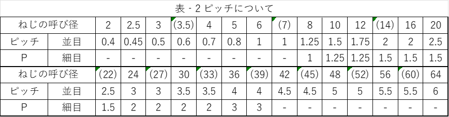 六角ナットのピッチは、表‐2の通りです。括弧を付けたものは、なるべく使用しないとされています。