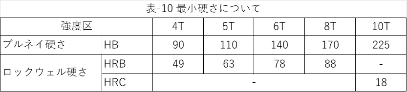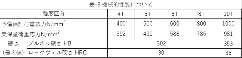 この附属書は、強度区分4T~10Tのナット(並目ねじ及び細目ねじ)の機械的性質とその試験、検査及び表示について規定されています。各強度区分の機械的性質を表‐9に示します。また、最小硬さを表-10に示します。