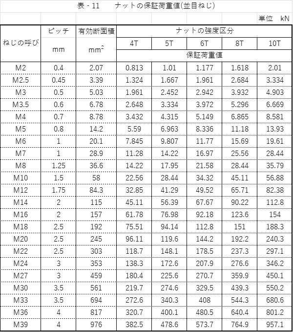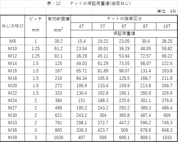 保証荷重試験は、JIS B 1052-2又は、JIS B 1052-6の保証荷重試験によります。並目ねじナットは表‐11の保証荷重値に、細目ねじナットは表‐12の保証荷重値に適合しなければならない。
