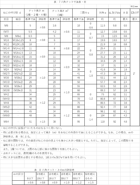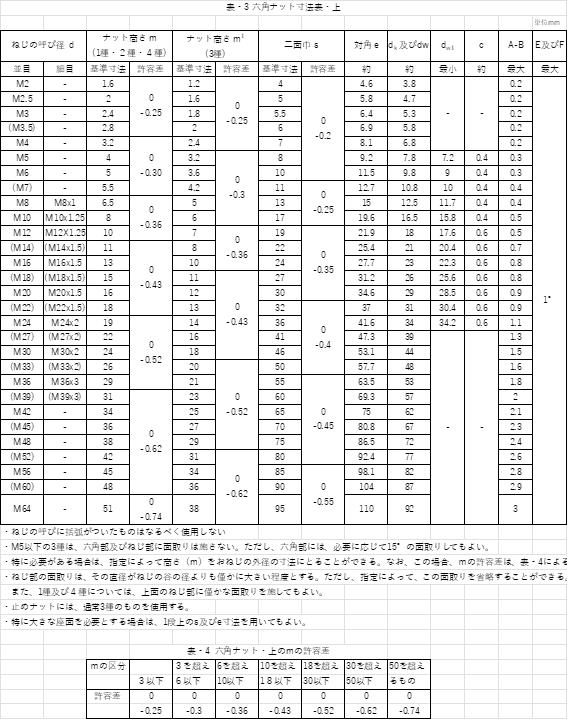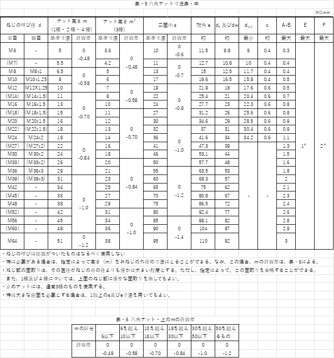 仕上げ程度によるナットの形状と寸法には、表‐3~8に、各種形状については図‐2に示します。
